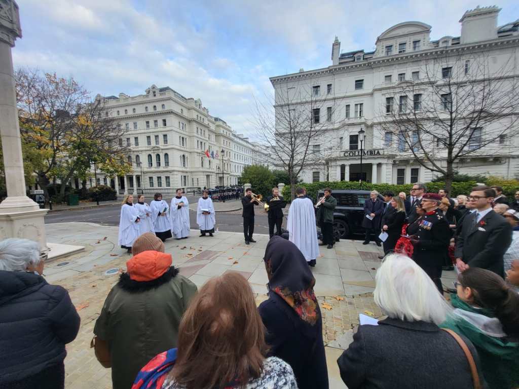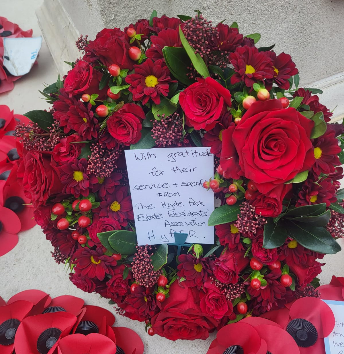 The Last Post was sounded and a two-minute silence was observed. Wreaths were laid by representatives of the Armed Forces, their associations in Paddington, local schools and housing associations. During the wreath laying, a brass band played Nimrod by Edward Elgar and the choir sang the anthem, ‘Upon your heart’ by Eleanor Daley. The dedication on HyPER’s card read “with gratitude for their service and sacrifice”.